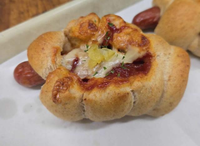 チョリソードック:チョリソーと赤パプリカをデスソースでからめ全粒粉の生地でまきこみました。辛口焼きカレー:ピリ辛口カレーとチーズをまぜ焼き込んだパン